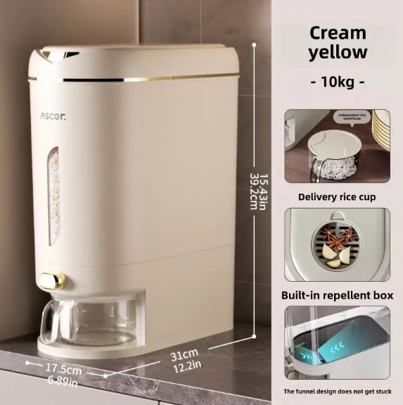 - Multi-use: Modernize your kitchen storage with our multi-purpose rice dispenser. Available in 10kg it stores black rice, barley, and other grains, keeping your pantry tidy and clutter.