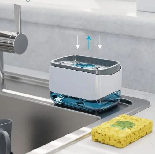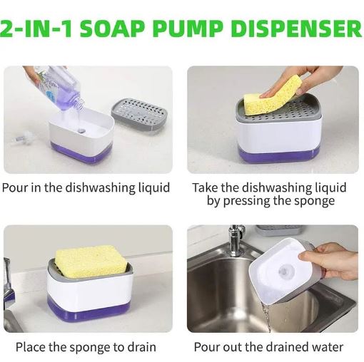 - This 2 in 1 liquid soap dispenser comes with a convenient sponge caddy holder, making it the perfect addition to any kitchen.