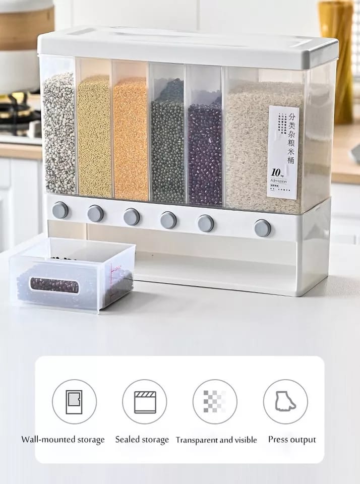 - Multiple Storage Grids :The dispenser has 6 grids, providing ample space to store not only rice but also other dry food items like fruits, nuts, and seeds.