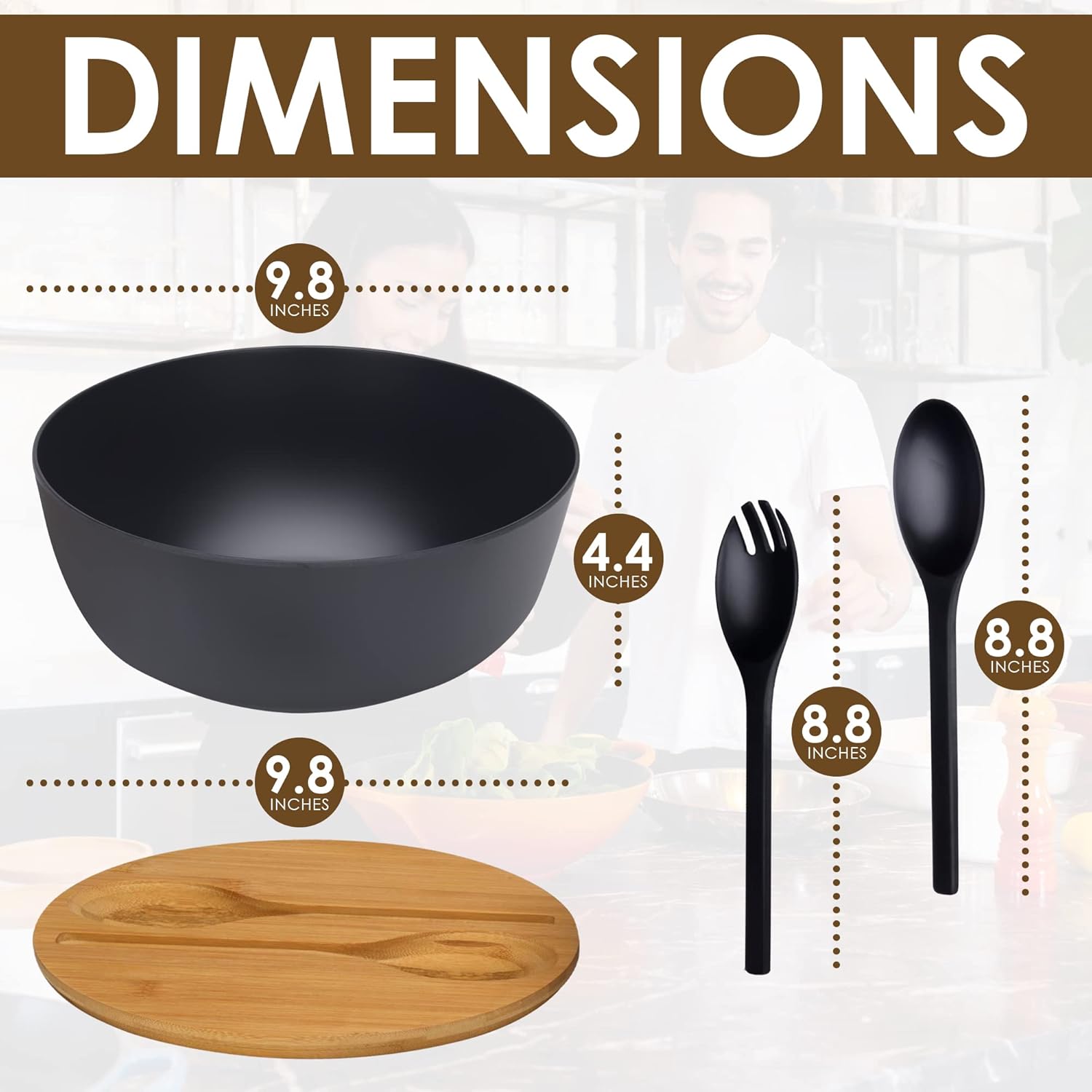 - SALAD BOWL SET: This salad bowl with lid includes an extra-large bowl, a serving spoon, a fork, and a lid. The lid includes an indentation for our spoon and fork, resulting in convenient storage. Our double-sided bamboo lids of a large salad bowl can be used as a cutting board.