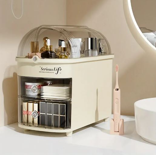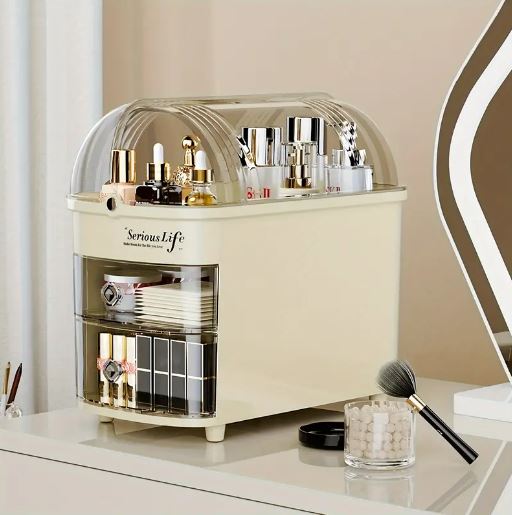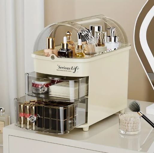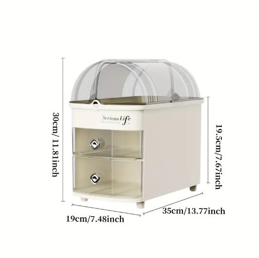 - This stylish and modern cosmetic organizer features a dome-shaped transparent lid to keep your beauty products dust-free and organized.