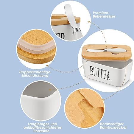 Porcelain Butter Dish with Butter Knife (500ml), Wooden Butter Keeper Container with Knife and Silicone Sealing